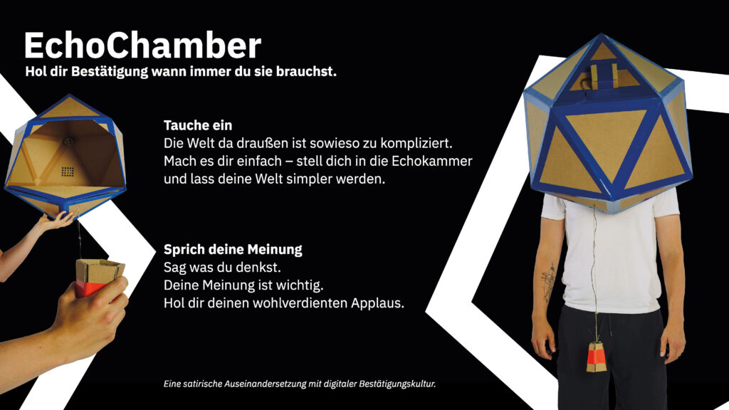 EchoChamber ist ein physisches Interface, das die digitale Echokammer und die unkritische Bestätigungskultur satirisch hinterfragt. Das Projekt transformiert den komplexen Außenraum in eine einfache, isolierte Realität, in der die eigene Meinung zur absoluten Wahrheit wird.