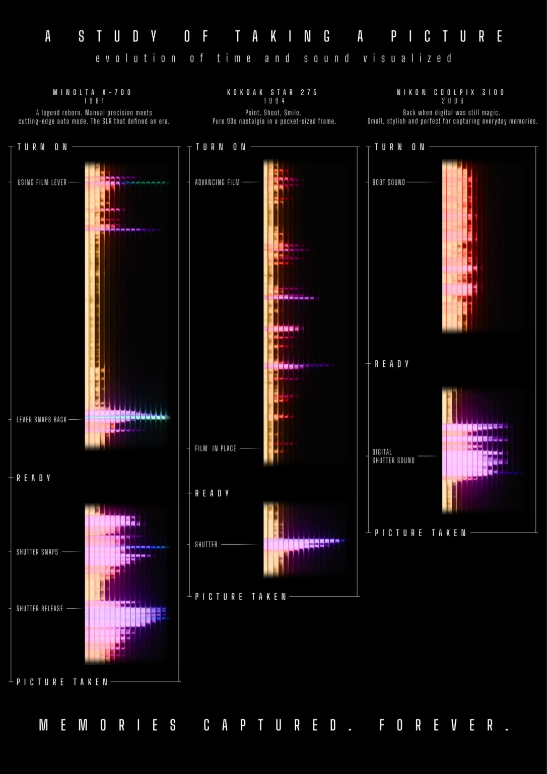 Dieses Poster visualisiert die Ein- und Ausschaltprozesse von drei Kameragenerationen (Minolta X-700, Kodak Star 275, Nikon Coolpix 3100) anhand ihrer zeitlichen Abläufe, akustischen Signale und Nutzerinteraktionen. Im Zentrum steht der Wandel der technischen und sensorischen Erfahrung beim Fotografieren – vom mechanischen Filmtransport bis zur digitalen Auslösung. Die klanglichen Phasen des Interaktionsprozesses (Boot, Ready, Shutter, Picture Taken) werden als visuelle Muster dargestellt und ermöglichen so einen direkten Vergleich der Geräte hinsichtlich Dauer, Feedback und Nutzungssituation. Das Design verbindet datenbasierte Darstellung mit nostalgischem Storytelling und schafft eine multisensorische Reflexion über technische Entwicklung.